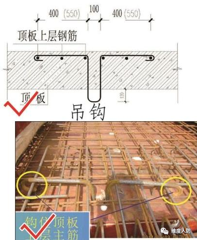a.設備吊環勾住頂板的上層鋼筋網(正確做法):