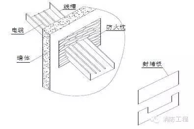 3.線槽橋架在跨越防火分區及線槽穿樓板的部位做防火封堵處理。封堵板用2mm厚防火板,具體做法如圖所示: