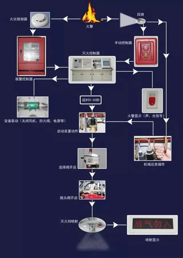 將滅火控制器上的控制方式選擇鍵撥至“手動”位置,滅火系統則處于電氣手動控制狀態。當保護區發生火情時,可按下手動控制盒或滅火控制器上“啟動”按鈕,滅火控制器即發出聲光報警信號,同時發出聯動指令,相關設備聯動,經過一段延時時間,發出滅火指令,打開電磁瓶頭閥釋放啟動氣體,啟動氣體通過啟動管路打開相應的選擇閥和瓶頭閥,釋放滅火劑,實施滅火。