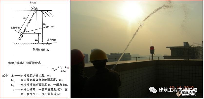 試射要求:試射仰角約為45~60°,充實水柱長度100m以下建筑為10m,超過100m的充實水柱為13m。