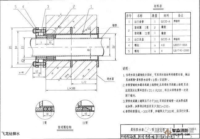 4、剛性防水套管適用于管道穿墻處不承受管道振動和伸縮變形的構(建)筑物,對于地震設防要求的地區,如采用剛性防水套管,應在進入池壁或建筑物上墻的管道上就近設置柔性連接,A型適用于鋼管,B、C型適用于球墨鑄鐵管。