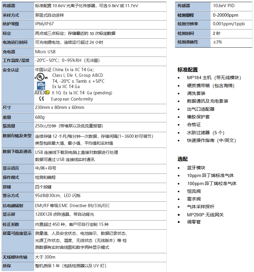 MP184 手持式檢測儀秉承了將 PID 方式應(yīng)用于 VOC 快速檢測的初衷,為客戶提供便攜、準(zhǔn)確、快速和兼具經(jīng)濟性的檢測產(chǎn)品。MP184 實時檢測數(shù)據(jù)有圖形和數(shù)字兩種顯示模式,智能繪圖顯示氣體濃度動態(tài),支持中英文操作界面;低功耗檢測器,一次充電可支持超過 24 小時連續(xù)檢測;數(shù)據(jù)自動存儲,數(shù)據(jù)下載方式可以通過有線或者無線方式,數(shù)據(jù)實時通訊亦可以選擇有線或者無線方式。其中無線方式可以靈活的選擇藍牙或者無線模塊, MP184 內(nèi)置跌倒報警結(jié)合無線傳輸功能,將現(xiàn)場檢測數(shù)據(jù)實時傳輸?shù)奖O(jiān)測端同時保護了現(xiàn)場工作人員的職業(yè)衛(wèi)生健康與安全。