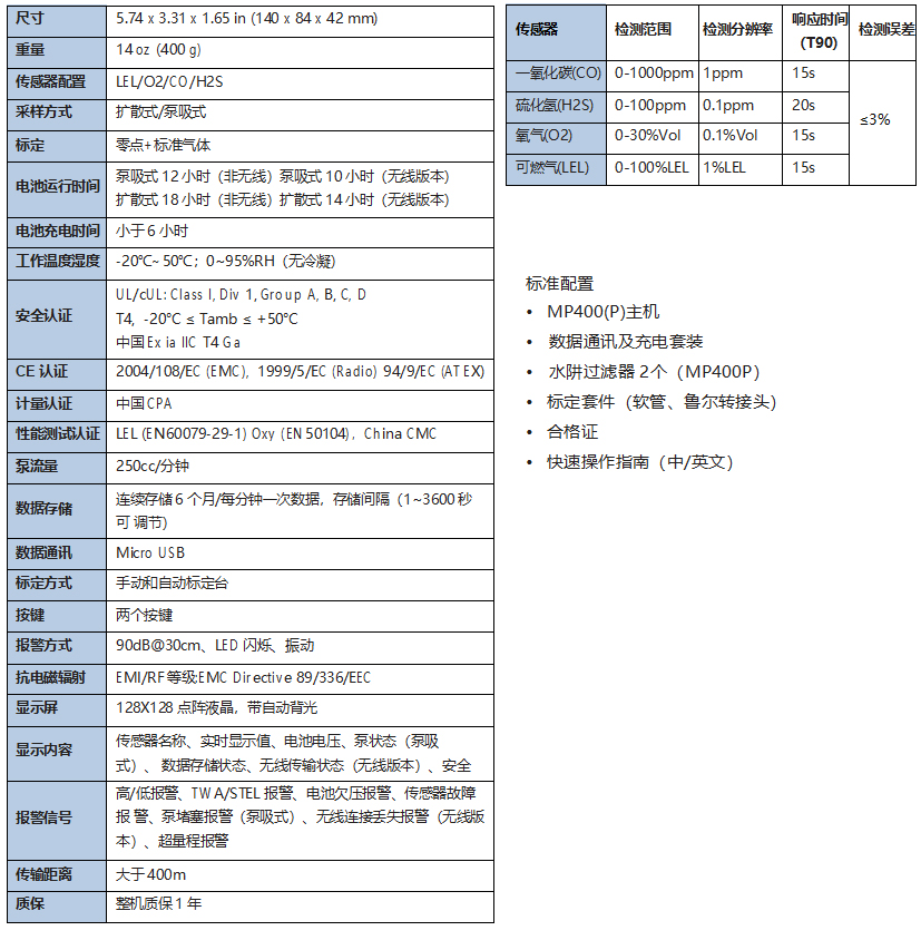 MP400(P)便攜式四氣體檢測儀可同時對可燃氣體、氧氣、一氧化碳和硫化氫進行準確檢測,同時給使用者帶來了前 所未有的友好以及靈活性的無線檢測體驗。MP400(P)可以預見對使用者以及裝置潛在威脅,可連續性檢測以及為決 策者提供更快的反應時間和科學決斷。MP400(P)具有泵吸式和擴散式兩個版本。可被廣泛的應用在冶金、石油石 化、化工、消防、電信、市政、污水處理等行業。
