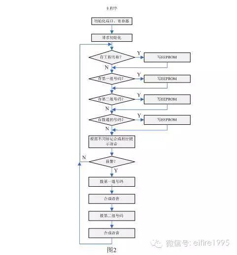 主程序主要完成初始化、存儲工程名稱及電話號碼、合成反映系統運行狀態的提示語音、撥打預設的電話、合成報警語音等。其框圖如圖2所示。