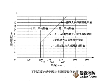 (2)當梁突出頂棚的高度為200mm~600mm時,應按附錄四、附錄五確定梁對探測器保護面積的影響和一只探測器能夠保護的梁間區域的數量。