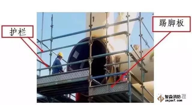 護欄:作業(yè)層的外部和端部要有雙層的防護欄桿,防護欄桿高度為1.0-1.2m,靠近底部應(yīng)有不低于180mm的踢腳板。