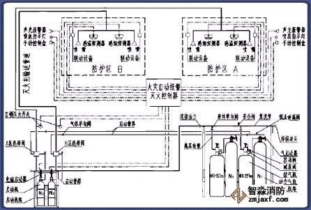 該系統由滅火劑瓶組、加壓氣體瓶組、驅動氣體瓶組(可選)、單向閥、選擇閥、減壓裝置、驅動裝置、集流管、連接管、噴頭、信號反饋裝置、安全泄放裝置、控制盤、檢漏裝置、管道管件及吊鉤支架等組成。
