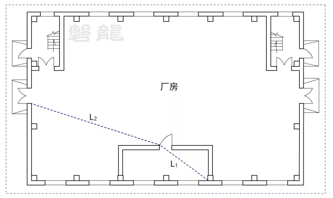2、廠房倉(cāng)庫(kù)同樣不應(yīng)采用嵌套(穿套)設(shè)置的方式,確因功能需要,嵌套(穿套)設(shè)置的房間不應(yīng)超過(guò)一級(jí),疏散距離應(yīng)按人員行走的直線距離計(jì)算,在圖示6的廠房中,示例房間內(nèi)任一點(diǎn)至安全出口的直線距離,應(yīng)為L(zhǎng)1+L2。