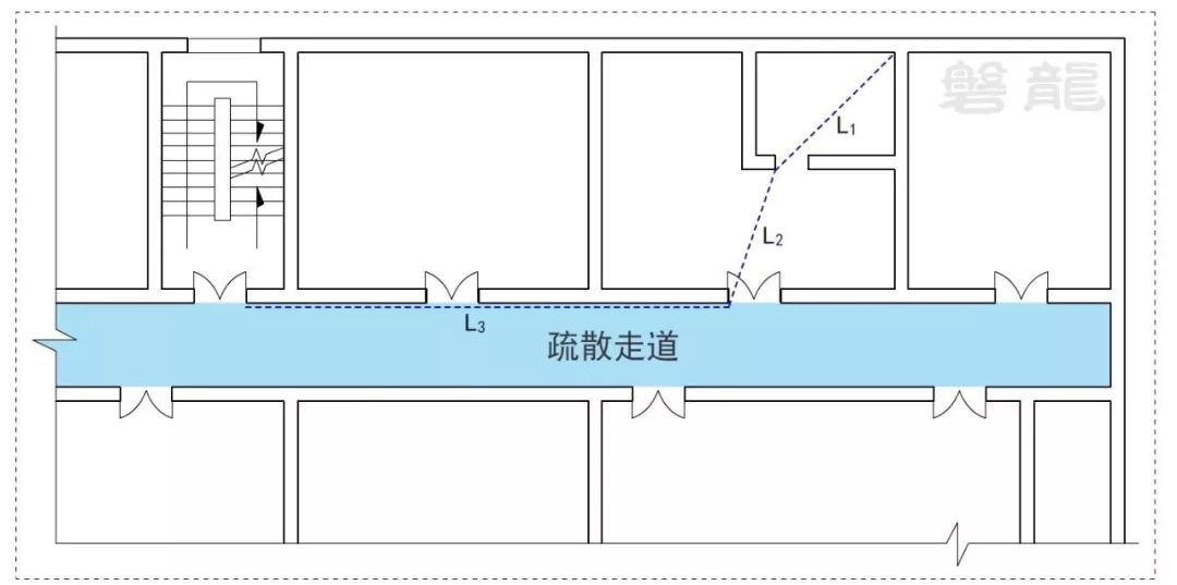 3、確因功能需要,嵌套(穿套)設(shè)置的房間不應(yīng)超過(guò)一級(jí),疏散距離應(yīng)按人員行走的直線距離計(jì)算,在圖示4的公共建筑中,示例房間內(nèi)任一點(diǎn)至房間直通疏散走道的疏散門(mén)的直線距離,應(yīng)為L(zhǎng)1+L2。