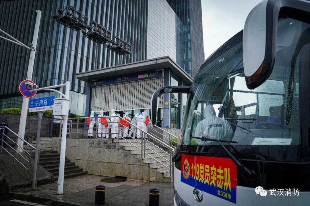 當天下午,武漢消防“119黨員突擊隊”15 名消防員進入武漢軌道交通 2 號線洪山廣場站內進行科學消毒