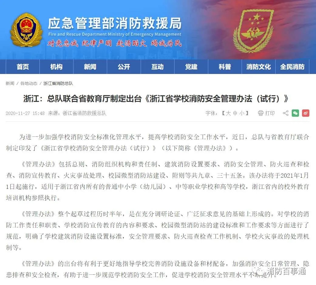 為進(jìn)一步加強(qiáng)學(xué)校消防安全管理,提高學(xué)校消防安全工作水平,結(jié)合浙江教育實(shí)際,我廳會(huì)同省應(yīng)急管理廳、省消防救援總隊(duì)聯(lián)合制定出臺(tái)《浙江省學(xué)校消防安全管理辦法(試行)》(以下簡(jiǎn)稱《管理辦法》)。