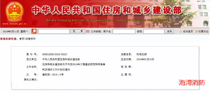 近日,住房和城鄉建設部發布了關于印發《2019年工程建設規范和標準編制及相關工作計劃的通知》,其中提到了2019年跟消防相關的部分規范的制定與修訂,我們一起來看一下吧!