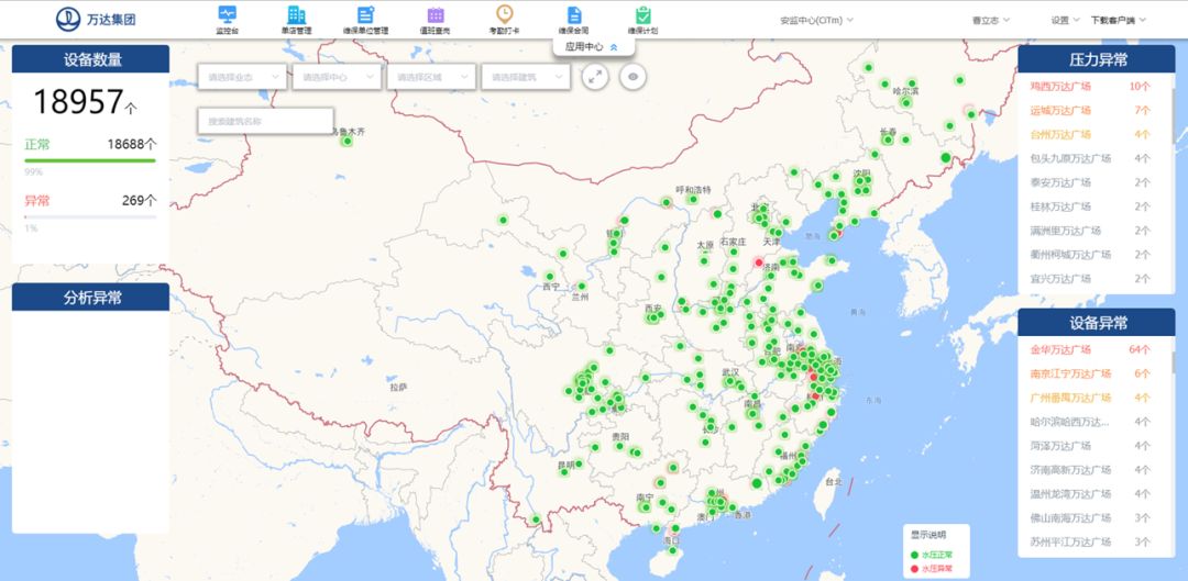 首先是巨大的中國地圖,萬達管理的全國所有廣場、酒店、樂園等在營業(yè)的物業(yè)一覽無余,綠色的點代表一切運轉(zhuǎn)正常,如果出現(xiàn)紅色則代表著某個環(huán)節(jié)出現(xiàn)了隱患,激活了報警。