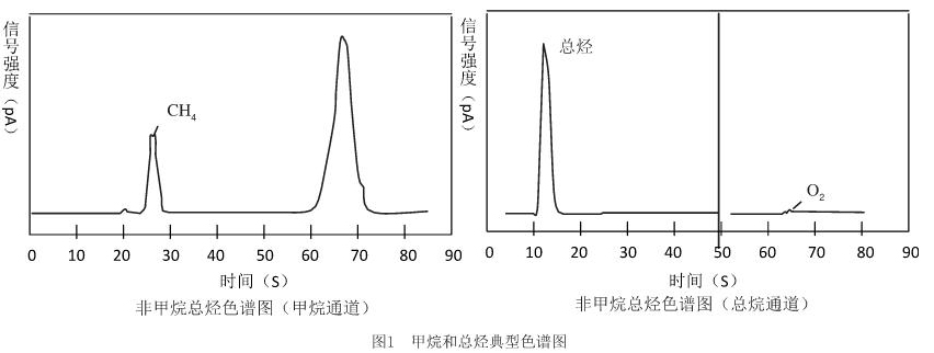 (3)采用兩個定量環,兩根色譜柱,一個F ID檢測器測定總烴和甲烷的濃度,色譜圖見圖3