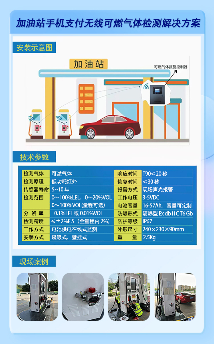 經(jīng)估算正常車主進站內(nèi)支付時間約為3-5分鐘,加油作業(yè)區(qū)手機支付時間約為30秒至1分鐘。手機支付的使用會提升加油站服務效率,減少客戶擁堵、等待時間,提高油品銷量,增強加油車主的加油體驗,增加提高了客戶粘性。另外加油進行時部分車主及乘客會在車內(nèi)打電話、看視頻等,這些無意識操作可能會給加油站帶來潛在風險。為加強加油站現(xiàn)場油氣安全風險管控、提高支付效率,促進油品銷量,滿足AQ3010標準,需要在各加油站作業(yè)現(xiàn)場安裝可燃氣體報警設(shè)備。