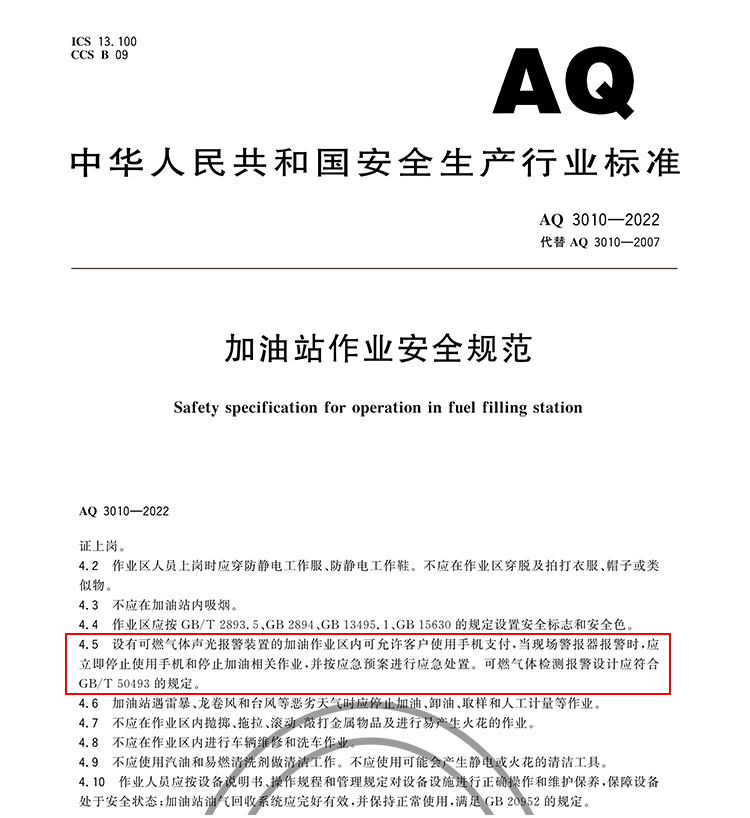 根據(jù)應急管理部日前批準發(fā)布的AQ 3010-2022《加油站作業(yè)安全規(guī)范》,考慮到加油站特殊場所,為加強油氣安全風險管控,在標準4.5條中寫到:設(shè)有可燃氣體聲光報警裝置的加油作業(yè)區(qū)內(nèi)可允許客戶使用手機支付,當現(xiàn)場報警器報警時,應立即停止使用手機和停止加油相關(guān)作業(yè),并按應急預案進行應急處置。可燃氣體檢測報警設(shè)計應符合GB/ T50493的規(guī)定。此新規(guī)于2023年4月1日起正式實施。