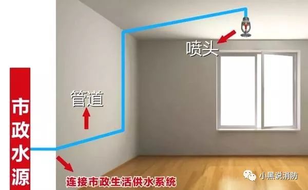 這種簡易噴淋系統由消防水源(可直接采用市政管道供水)、噴頭、管道等組成。