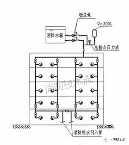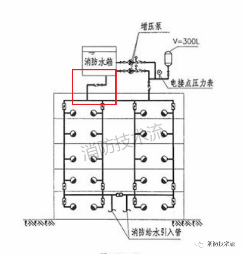 高位消防水箱的主要作用是供給建筑初期火災(zāi)時的消防用水水量,當(dāng)消防水滅火系統(tǒng)例如室內(nèi)消火栓系統(tǒng)的穩(wěn)壓裝置設(shè)置在高位時,因高位消防水箱經(jīng)過穩(wěn)壓裝置與消防管網(wǎng)連接,容易漏設(shè)高位水箱的并聯(lián)重力出水管(如下圖)。