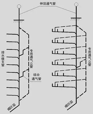 當(dāng)建筑物層數(shù)和衛(wèi)生器具較多時(shí),因排水量大,空氣流動(dòng)過程宜受排水過程干擾,須將排水管和通氣管分開,設(shè)專用通氣管道。