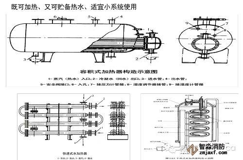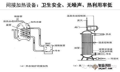 間接加熱設備:容積式水加熱器、快速式水加熱器、半即熱式水加熱器 、分段式水加熱器。