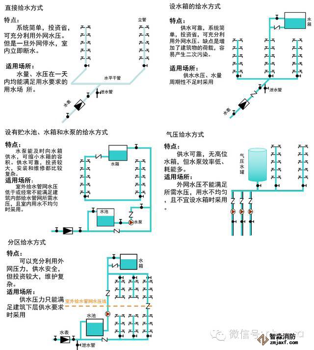 適用條件:設水池、水泵的給水方式適用于所需的建筑。