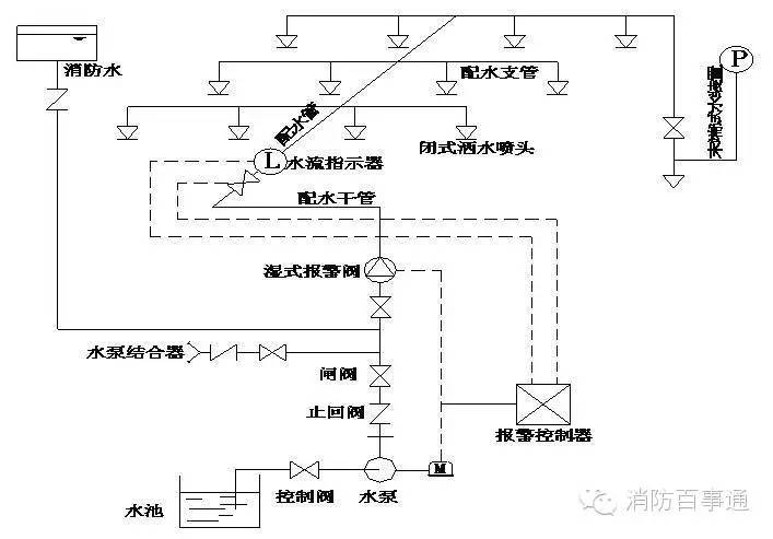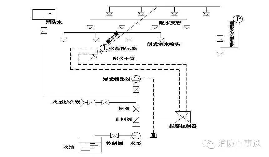 由噴頭、管道系統、濕式報警閥、報警裝置和供水設施等組成。由于該系統在報警閥的前后管道內始終充滿著壓力水,故稱濕式噴水滅火系統或濕管系統。