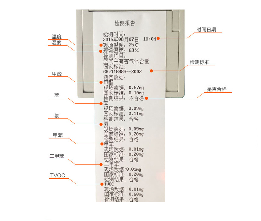 ▲現場測定甲醛含量,并可打印出甲醛、苯、氨、甲苯、二甲苯、TVOC、溫度、濕度、八項檢測結果。