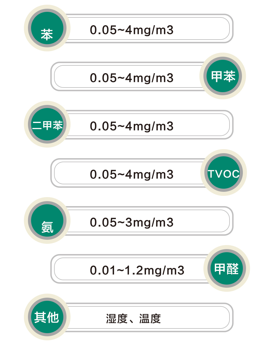 1.測試項目:甲醛、苯、氨、甲苯、二甲苯、TVOC