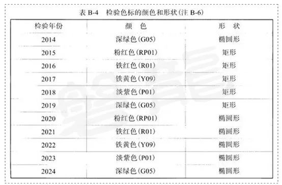 2、在定期檢驗鋼印標記上,應當按檢驗年份涂上檢驗色標,檢驗色標的顏色和形狀如下: