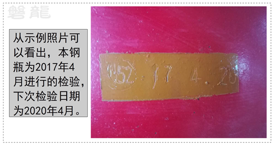從示例照片可以看出,本鋼瓶為2017年4月進行的檢驗,下次檢驗日期為2020年4月: