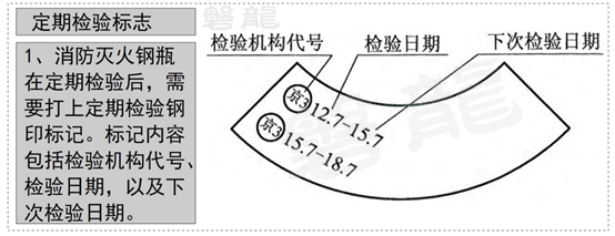 1、消防滅火鋼瓶在定期檢驗后,需要打上定期檢驗鋼印標記,標記內容包括檢驗機構代號、檢驗日期,以及下次檢驗日期:
