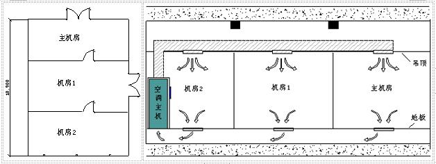 如下圖所示,若三個房間從吊頂?shù)降匕宥疾捎锚?dú)立的空調(diào)系統(tǒng),那么將機(jī)房1和機(jī)房2劃作一個區(qū)域或劃為兩個單獨(dú)滅火區(qū)都是可行的。但如果采用一臺精密空調(diào)為三個房間服務(wù)且為“上送風(fēng),地板下回風(fēng)”方式這三個房間就必須劃分成一個滅火區(qū)域,藥劑儲備應(yīng)該是上者的3倍或1.5倍,對工程的投資影響是比較大的。除過滅火劑和噴放管道布置要作為一個保護(hù)區(qū)考慮外,探測范圍也應(yīng)該分塊進(jìn)行探測但還是一個探測區(qū)域,警報區(qū)域也應(yīng)該按照一個區(qū)域來設(shè)置和聯(lián)動。
