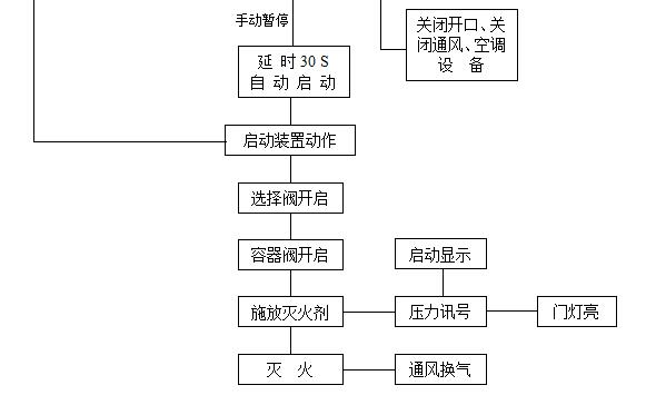 發(fā)生火災(zāi)時,當(dāng)一路探測器報警后,設(shè)在該防護(hù)區(qū)域內(nèi)的警鈴動作;兩路探測器都報警后,設(shè)在該防護(hù)區(qū)域內(nèi)外的蜂鳴器及閃燈動作;系統(tǒng)進(jìn)入延時階段,控制盤完成相關(guān)設(shè)備的聯(lián)動控制。經(jīng)過延時后,控制盤輸出24V直流信號電源啟動儲氣瓶組上的電磁閥,打開儲氣瓶組釋放滅火劑氣體,滅火劑沿噴射短管和噴頭輸送到防護(hù)區(qū)域滅火。如值班人員先于火災(zāi)探測系統(tǒng)發(fā)現(xiàn)火情,當(dāng)用手提式滅火器或其它移動式滅火設(shè)備無法撲滅火災(zāi)時,可直接手動啟動來滅火。如發(fā)現(xiàn)是系統(tǒng)誤動作,或確有火災(zāi)發(fā)生但僅使用手提式滅火器和其它移動式滅火設(shè)備即可撲滅火災(zāi),可按下設(shè)在防護(hù)區(qū)域門外的緊急止噴按鈕,可以使系統(tǒng)暫時停止釋放藥劑。如需繼續(xù)開啟氣體滅火系統(tǒng),則只需松開緊急停止開關(guān)即可。