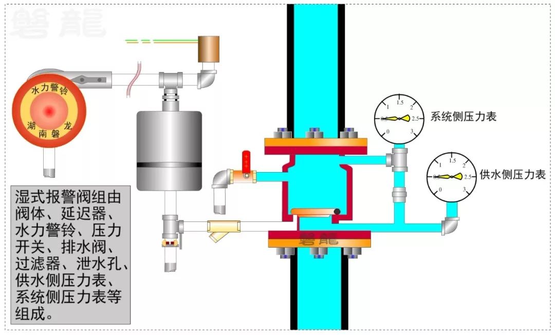 2、濕式報(bào)警閥的供水側(cè)和系統(tǒng)側(cè)都設(shè)置有壓力表,系統(tǒng)側(cè)壓力表指示系統(tǒng)側(cè)出口壓力,供水側(cè)壓力表指示供水側(cè)入口壓力。